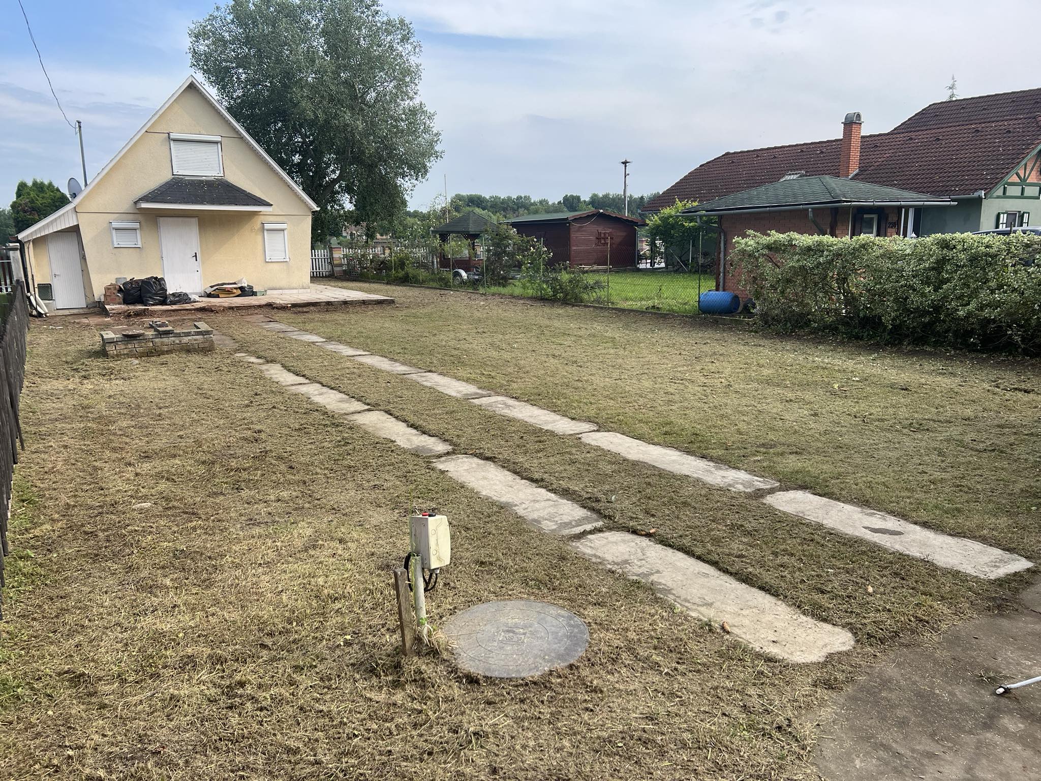 Parkolni a kertben, illetve a kert előtt lehetséges.