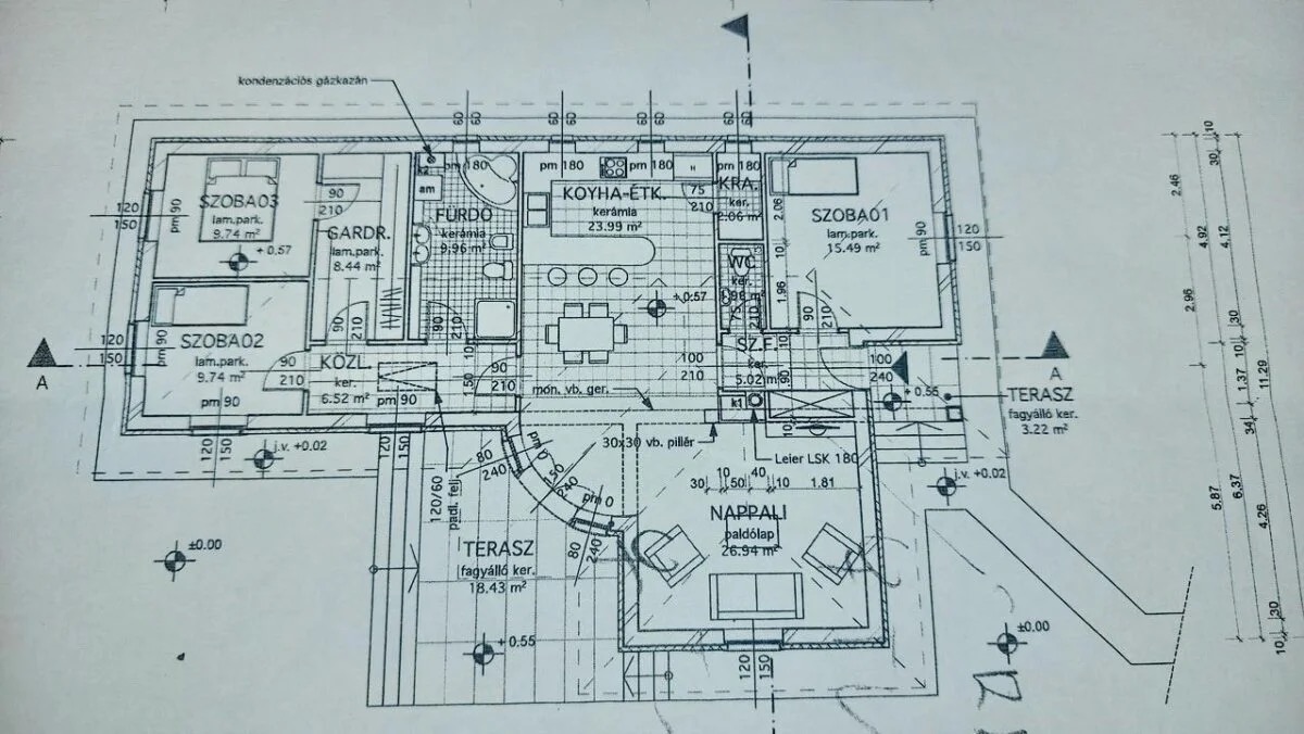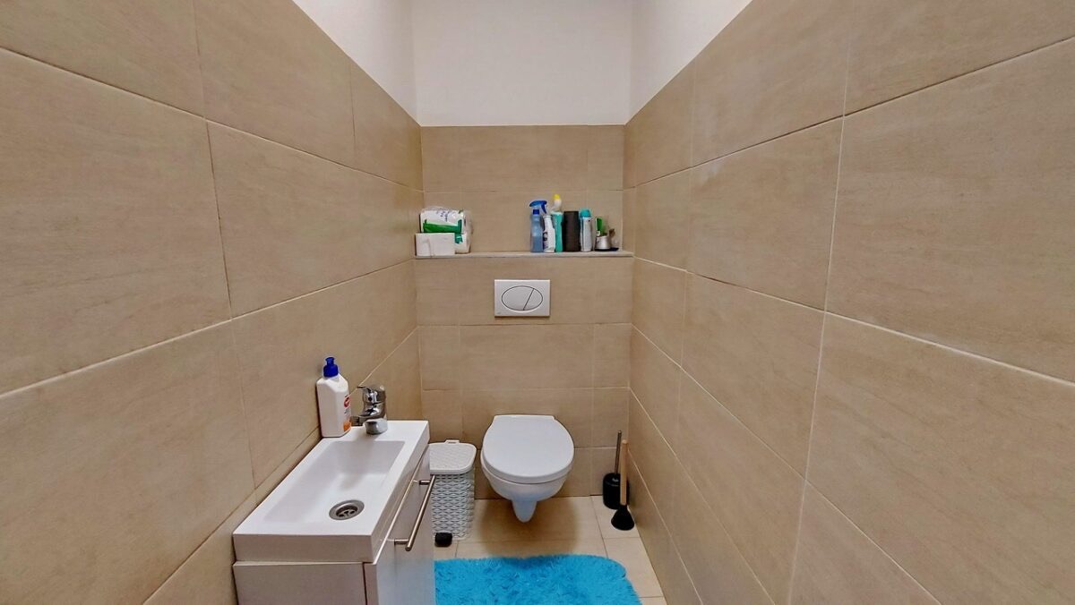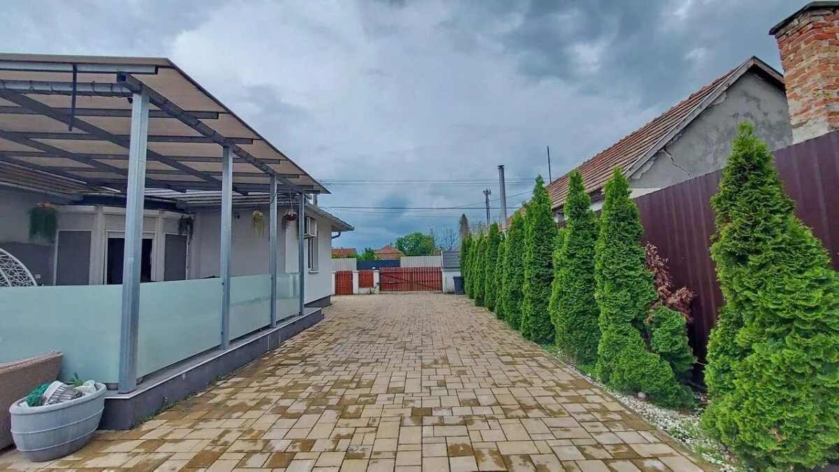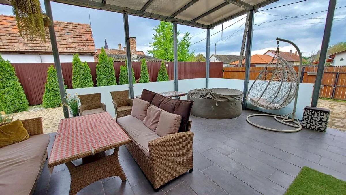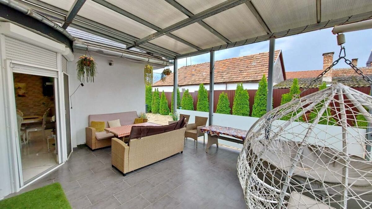 A konyha és étkező egy légtérben helyezkedik el, modern, beépített és gépesített konyhabútorral. A ház része gardrób, kamra, külön WC, valamint egy tágas fürdőszoba, ahol kád és zuhanyzó egyaránt rendelkezésre áll. A fedett nagy terasz kellemes helyszíne lehet a pihenésnek.