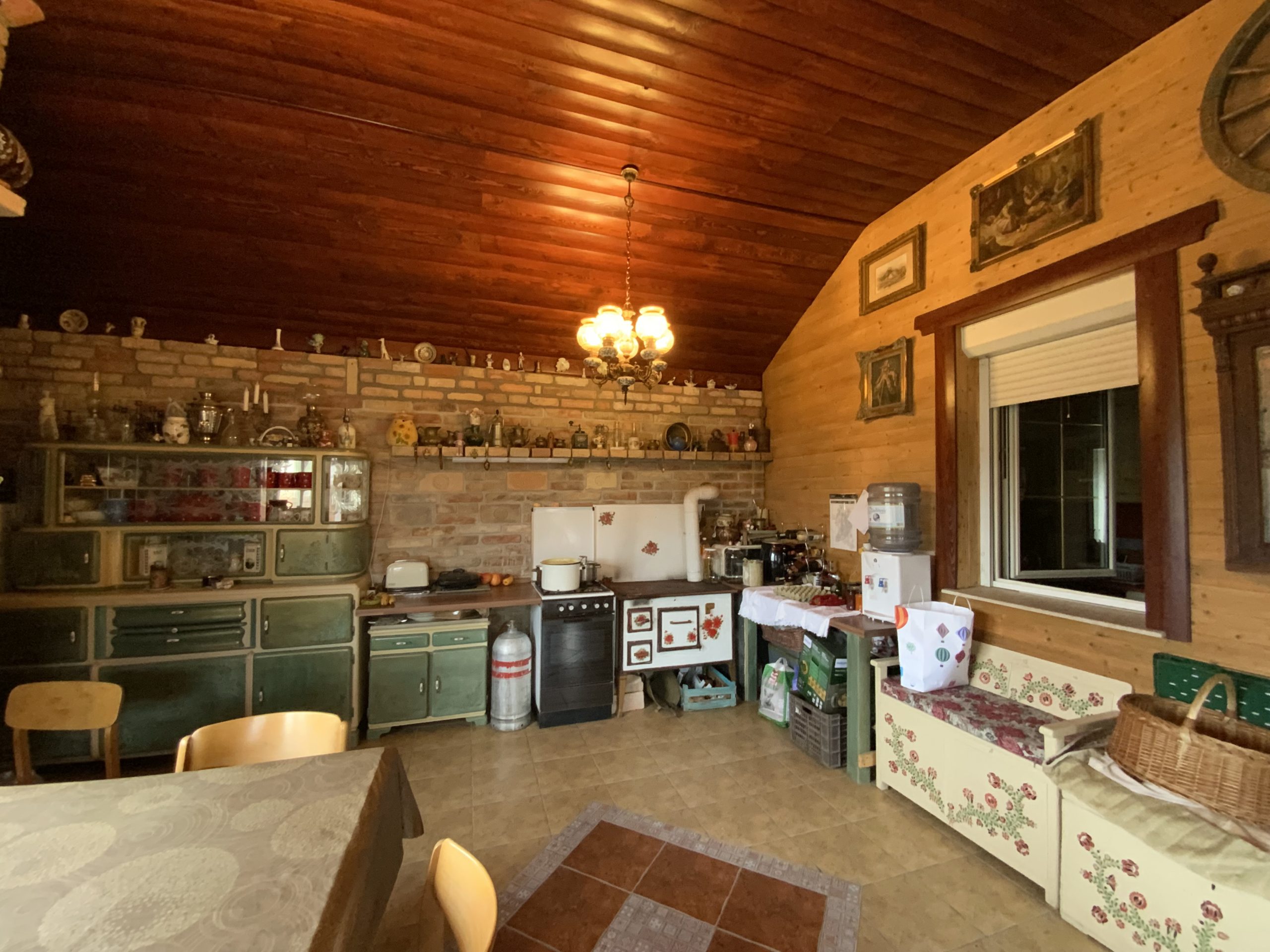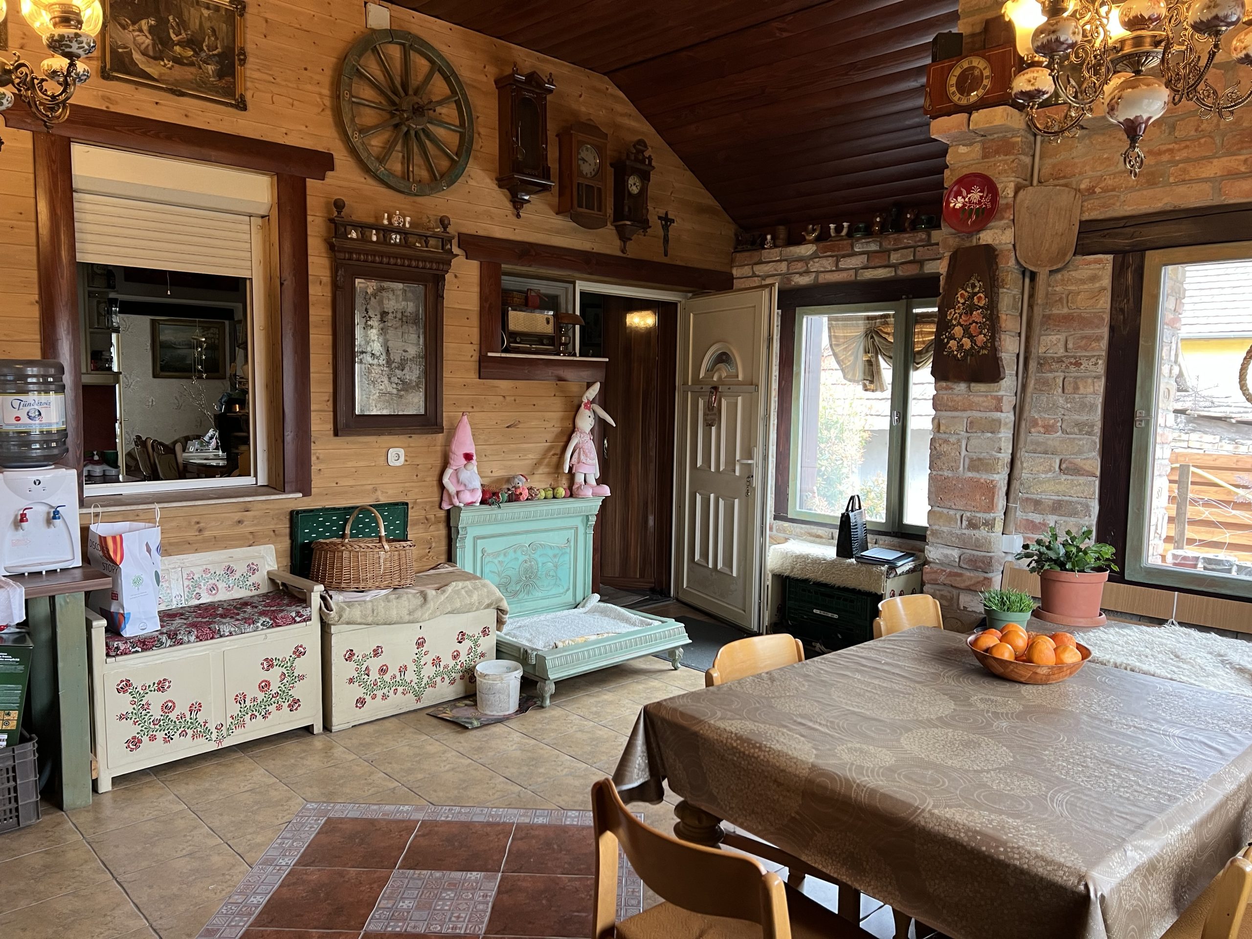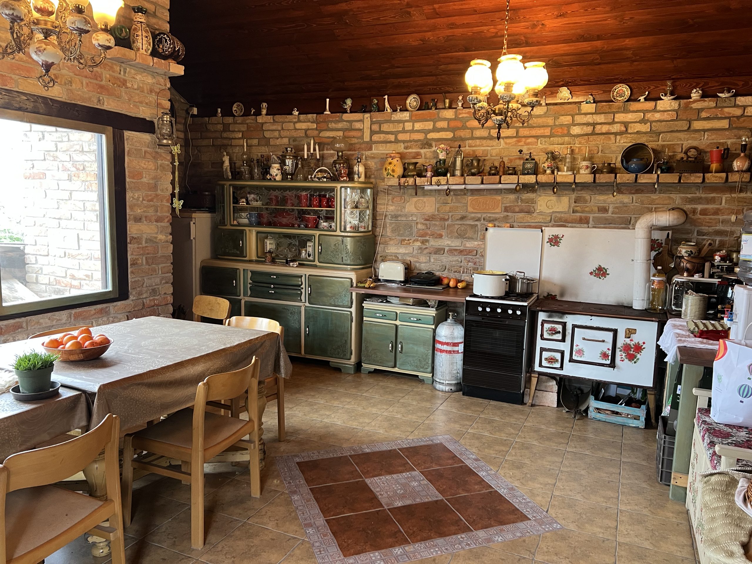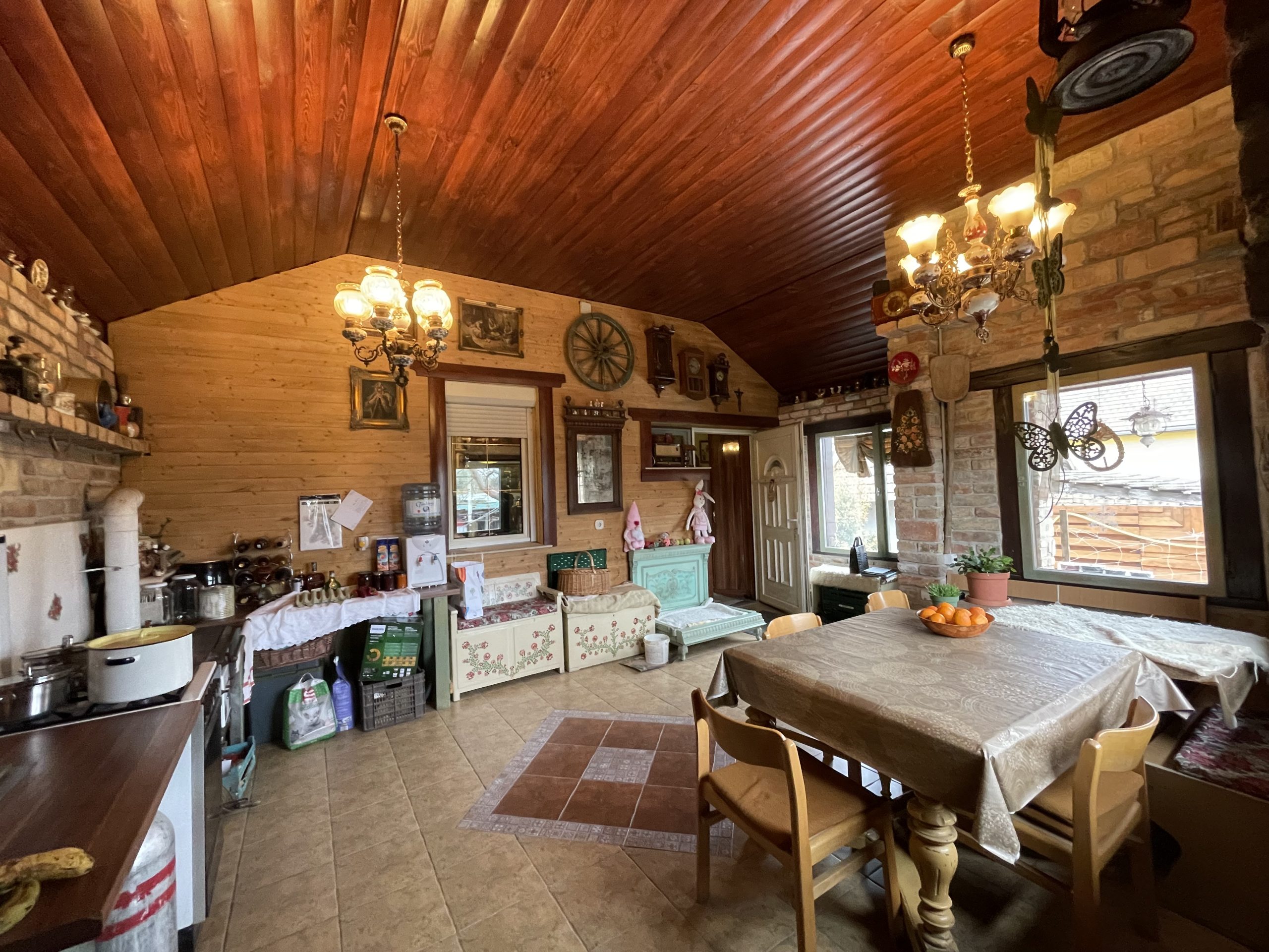 A ház különlegessége a gyönyörű dísztégla burkolatokkal kialakított, igényes rusztikus enteriőr, amely igazán egyedi hangulatot teremt